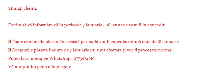 Politica de livrare :în cazul în care trebuie să se mențină o valoare mai mică de 200 de lei, clientul va suporta doar cheltuieli de transport aferente, care vor fi îngrijite în termen de 20 lei / comandă.Livrarea va fi efectuată de către GLS Romania